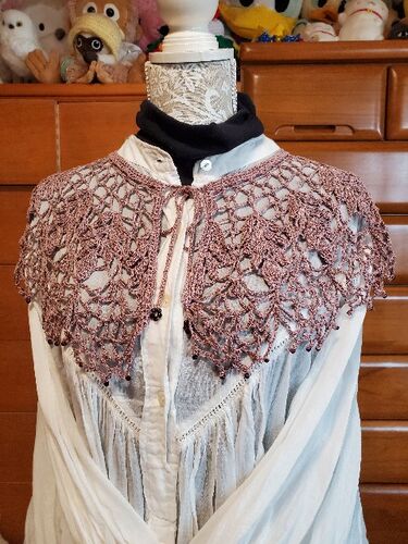 今日のお天気予報は…晴れ 最低気温14℃ 最高気温27℃ とてもいいお天気だし 雲がない…けど すごい青空って感じでもない…(^^; 写真撮っても… 真っ白になっちゃうパターンの空… 一昨日完成しました~☆ 大きめのつけ襟です♪ 最近は、オリジナルで 編むことが多か…