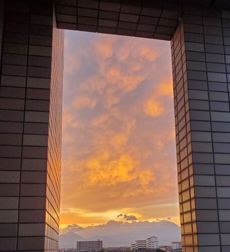 今日【9月27日】のお天気は… スクショ撮り忘れましたが この日は、朝早く起きたので 綺麗な朝焼けを撮ることが出来ました☆ 東の空がオレンジになってるのが なんか新鮮で…少しの間眺めてました… 夕焼けの時より 雲全体がオレンジ色~☆ ベランダの横の窓か…
